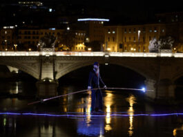 Andrea Loreni attraversa il Tevere su un cavo d’acciaio
